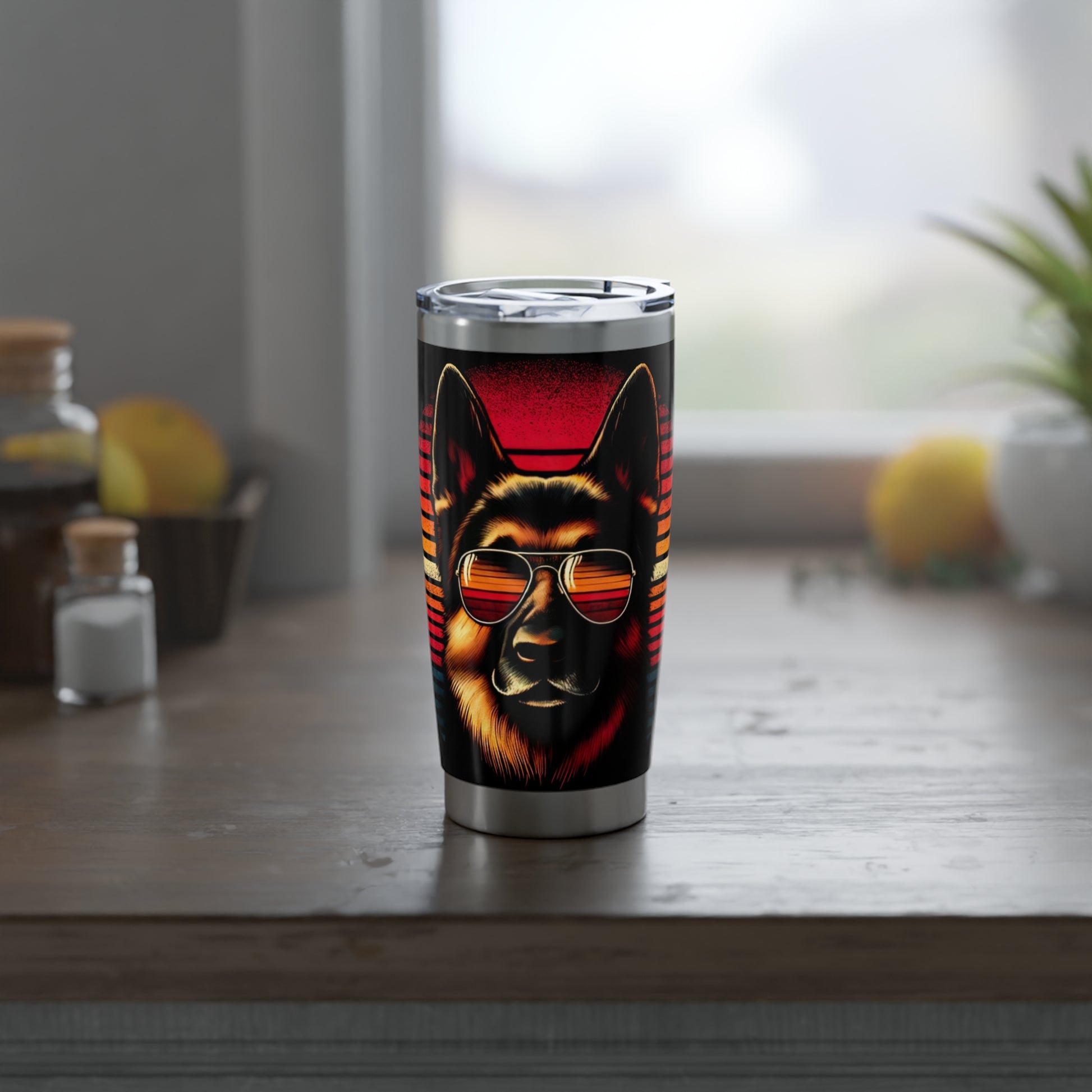 Step into the cool shade of style with this Stainless Steel Tumbler 20 oz, designed for those who both admire the sleek look of sunglasses at sunset and cherish the loyal company of German Shepherds. This tumbler features a suave German Shepherd sporting stylish red sunglasses, set against a fiery sunset background, embodying the epitome of cool.